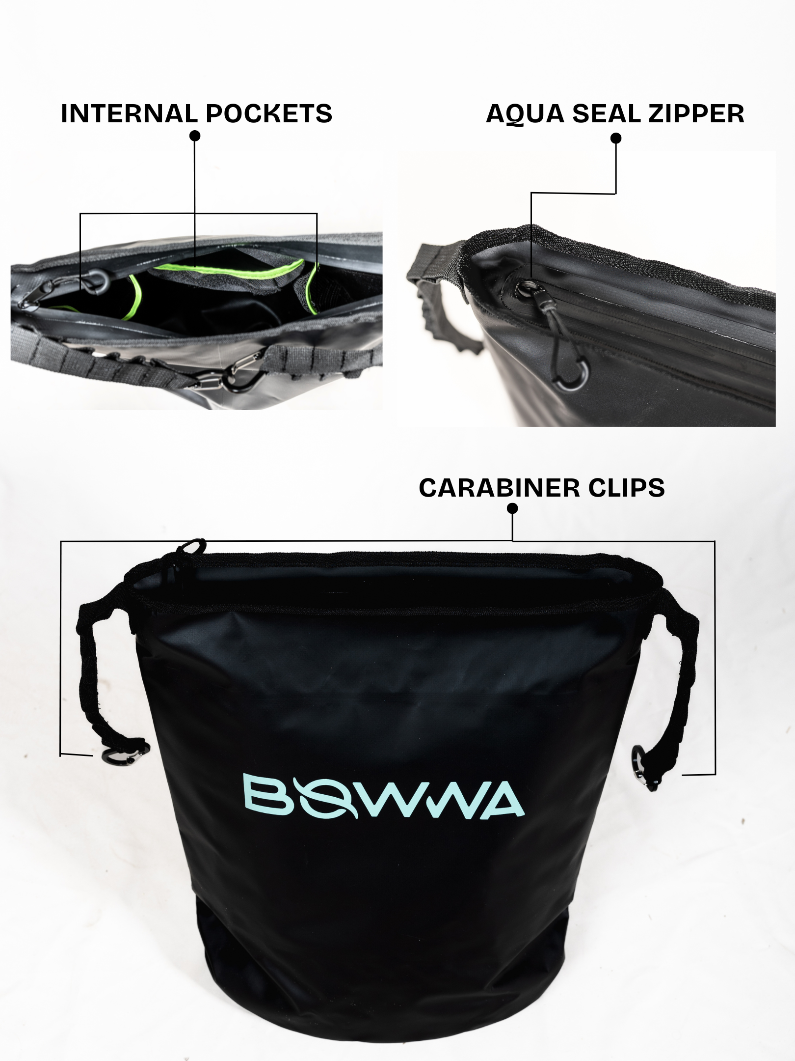 Clip in your Aqua Pouch to create three spaces within your bucket. Stash sopping wet wetsuits on one side, keep used towels contained on the other, and store dry essentials like phones and keys using the handy inner pockets inside the Aqua Pouch - everything has it's place!