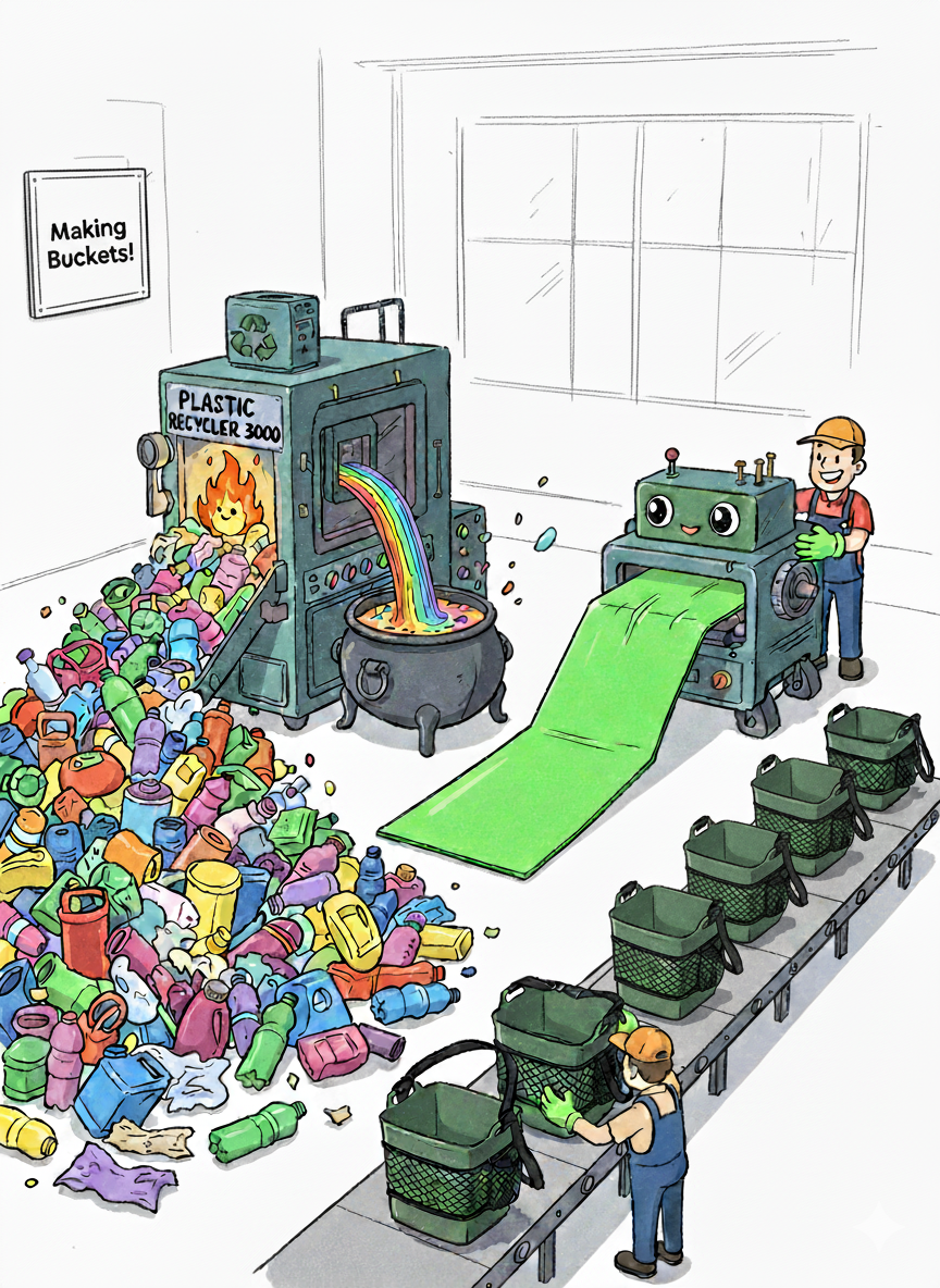 It all started with a broken bucket handle and a garage full of wasted plastic.
