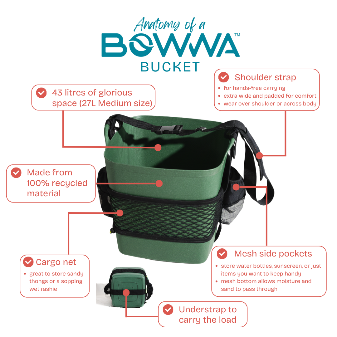 This is my second Bowwa bucket. The original big bucket for taking everything the family needs for a day at the beach and now the new 27L which is perfect When I head of for a solitary swim